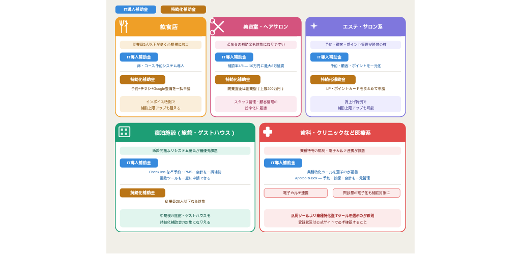 宿泊施設は販路開拓よりもシステム統合(予約・フロント・会計)が課題になりやすく、IT導入補助金の適性が高い業種です。