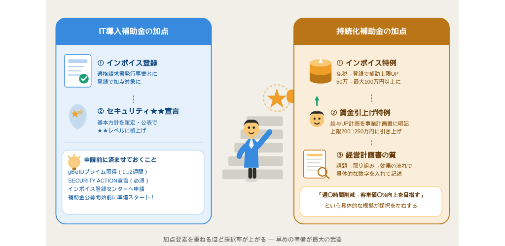 補助金の審査では、要件を満たすだけでなく「加点要素」を満たすことで採択率が高まります。2026年度に活用できる主な加点要素と具体的なアクションを紹介します。