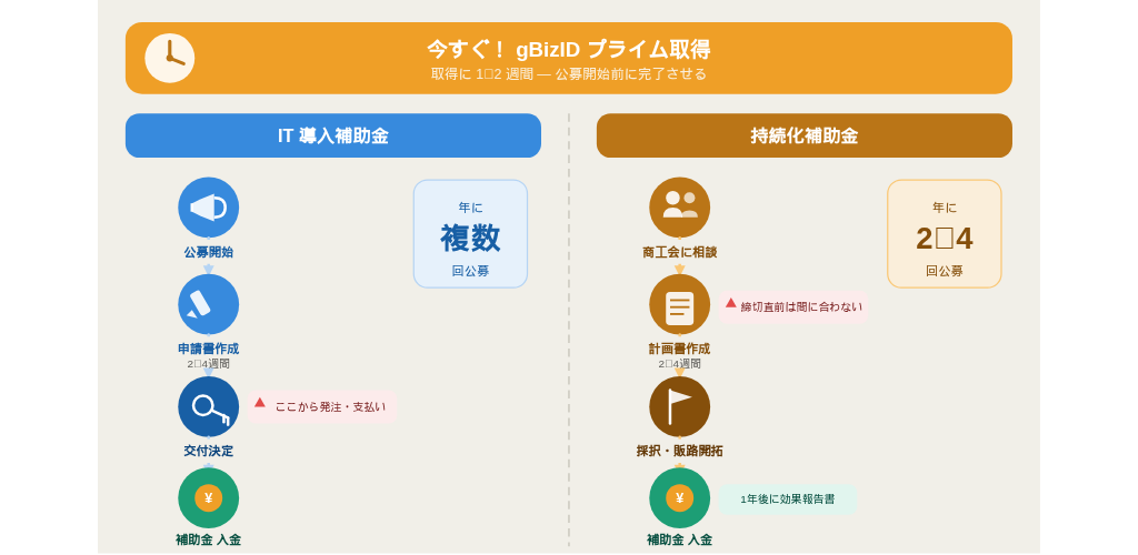 gBizIDプライムは補助金だけでなく、e-Govや社会保険手続きのオンライン申請にも使えるため、この機会に取得しておくと今後も役立ちます。
